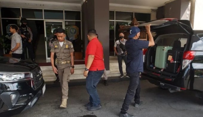 Koper-koper tersebut dimasukkan ke dalam minibus setelah tim penyidik menyelesaikan penggeledahan selama kurang lebih lima jam. Sedikitnya enam minibus tampak keluar masuk area perkantoran dengan pengawalan aparat kepolisian dan pengamanan dari Satpol PP.